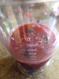 After our run yesterday, I opened one of the containers and poured the contents into the plastic mixing jar that came with my immersion blender. Then I added about 1/2 cup of frozen berries and whizzed it up!